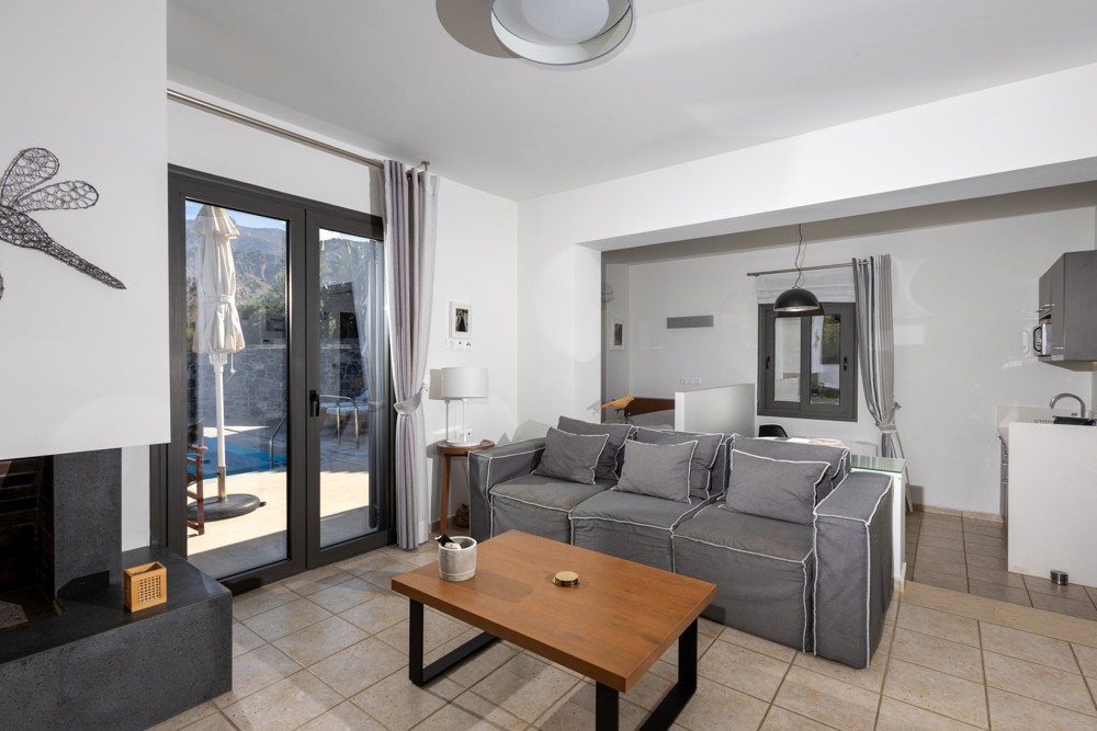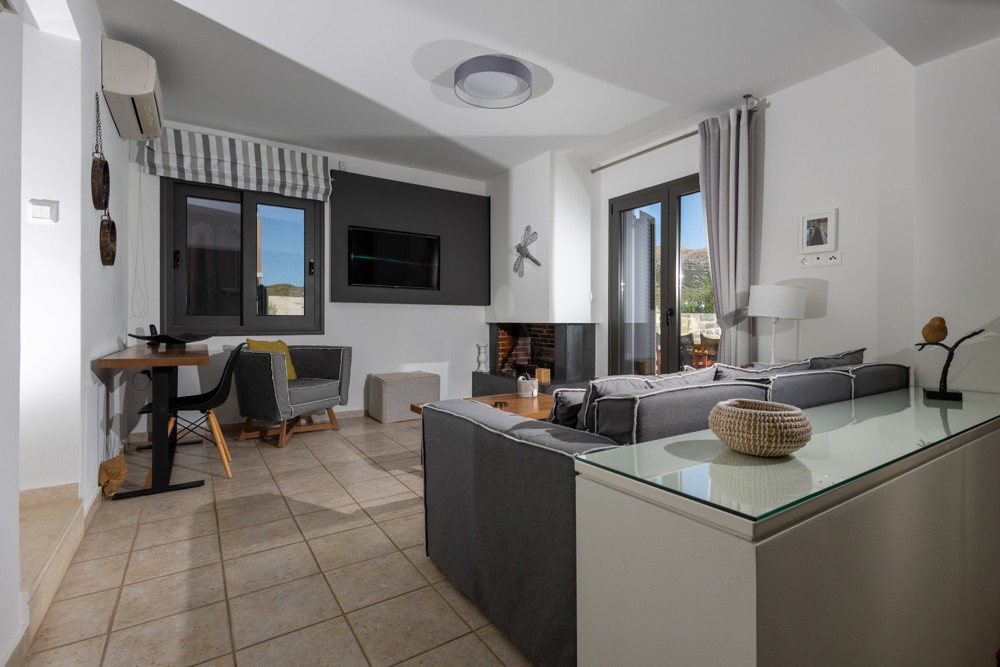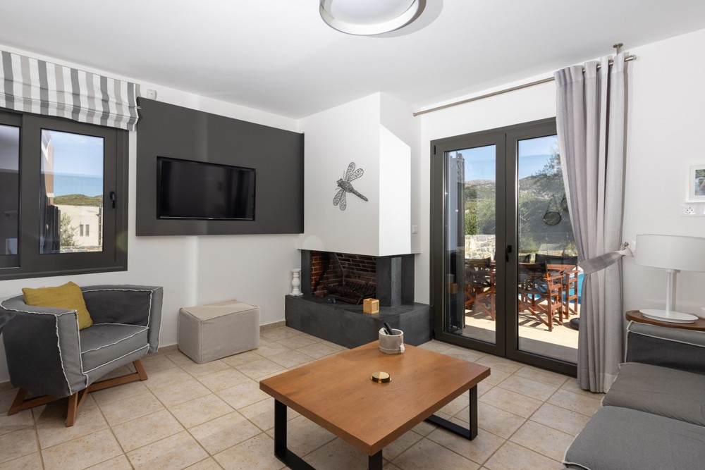 Fully equipment Grand villa. Living room with a sofa, armchair & fireplace.